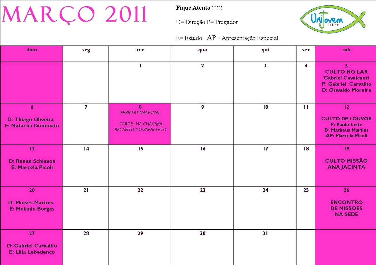 Sábado, 03/08, Culto no Lar. Sairemos da igreja às 19h.Participe!